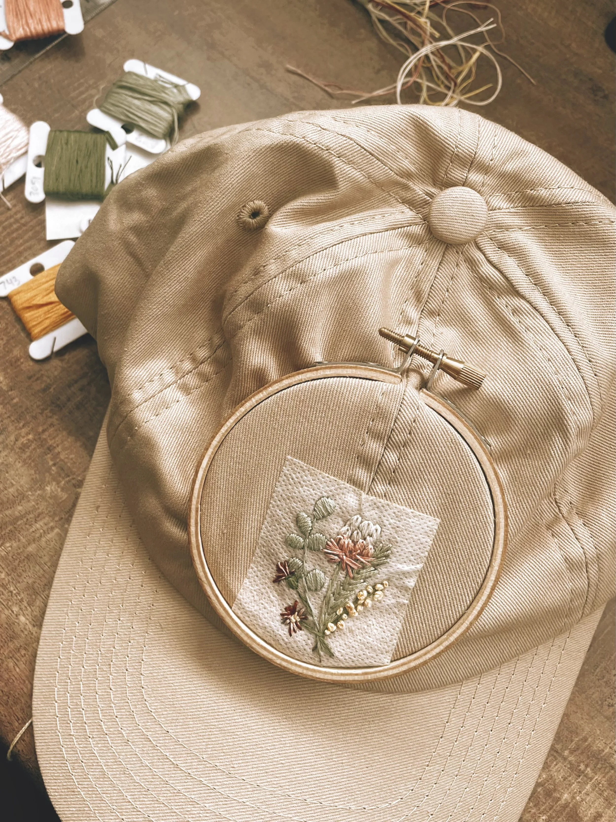 Once the design is ready, I transfer the sketch onto the cap, position it in the hoop, and begin stitching. This is where everything comes together — slowly, thoughtfully, and with great attention to detail. Each stitch is placed by hand, and no two caps are ever exactly the same. I love how this part of the process gives space for rhythm, rest, and creativity. It’s quiet work, but full of joy.
